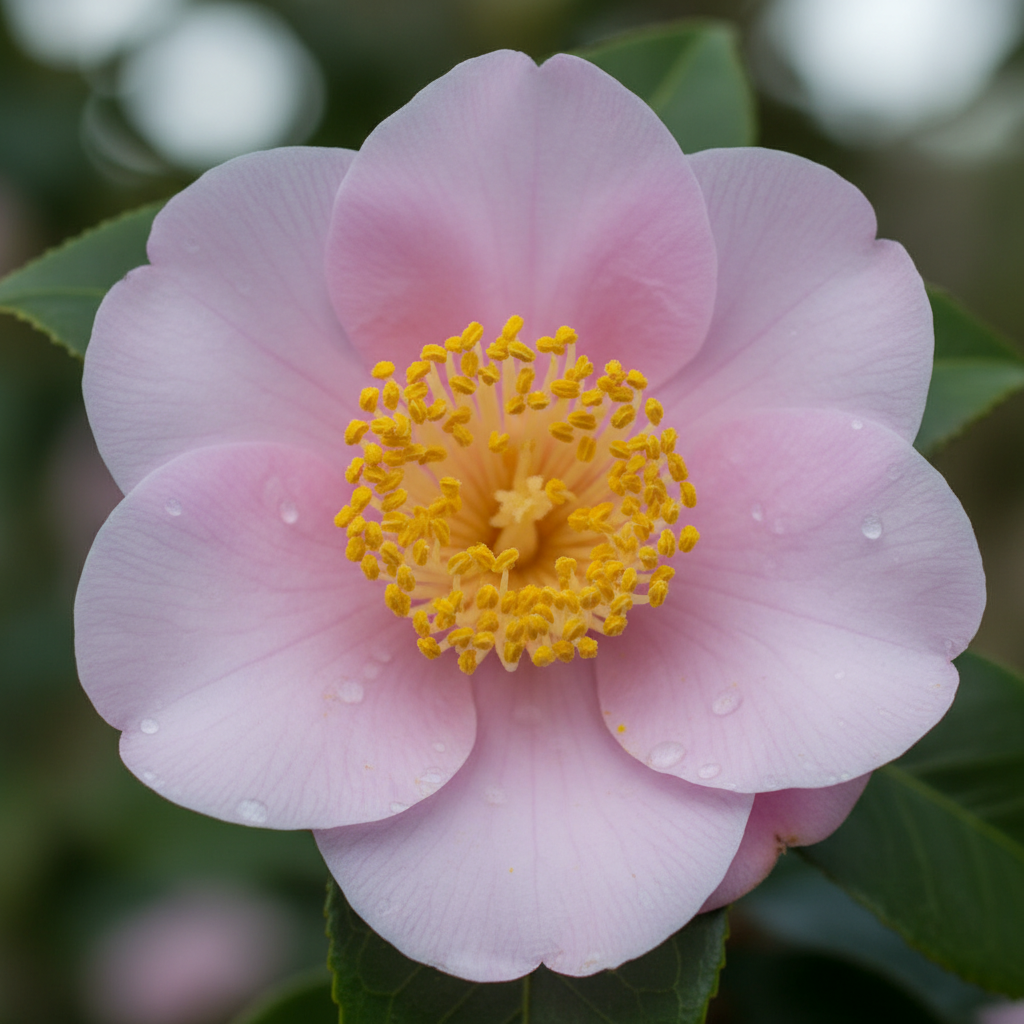 Camellia ‘April Blush’: Semi-double pale pink blooms